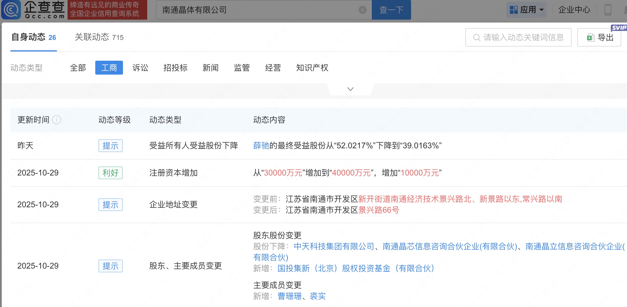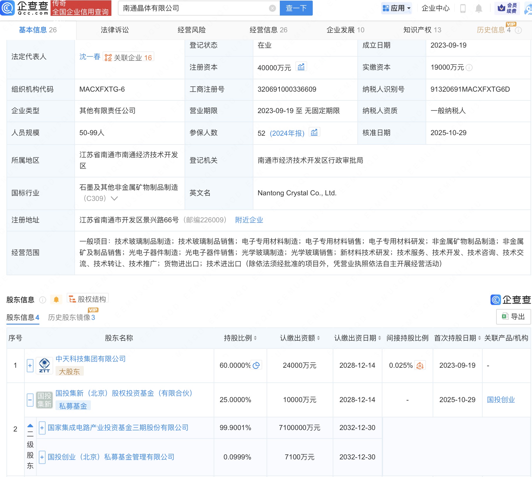 近日,南通晶体有限公司发生工商变更,新增国家大基金三期旗下国投集新(北京)股权投资基金(有限合伙)为股东,同时注册资本由3亿人民币增至4亿人民币。企查查信息显示,该公司成立于2023年,经营范围包含:电子专用材料制造;电子专用材料销售;电子专用材料研发等。