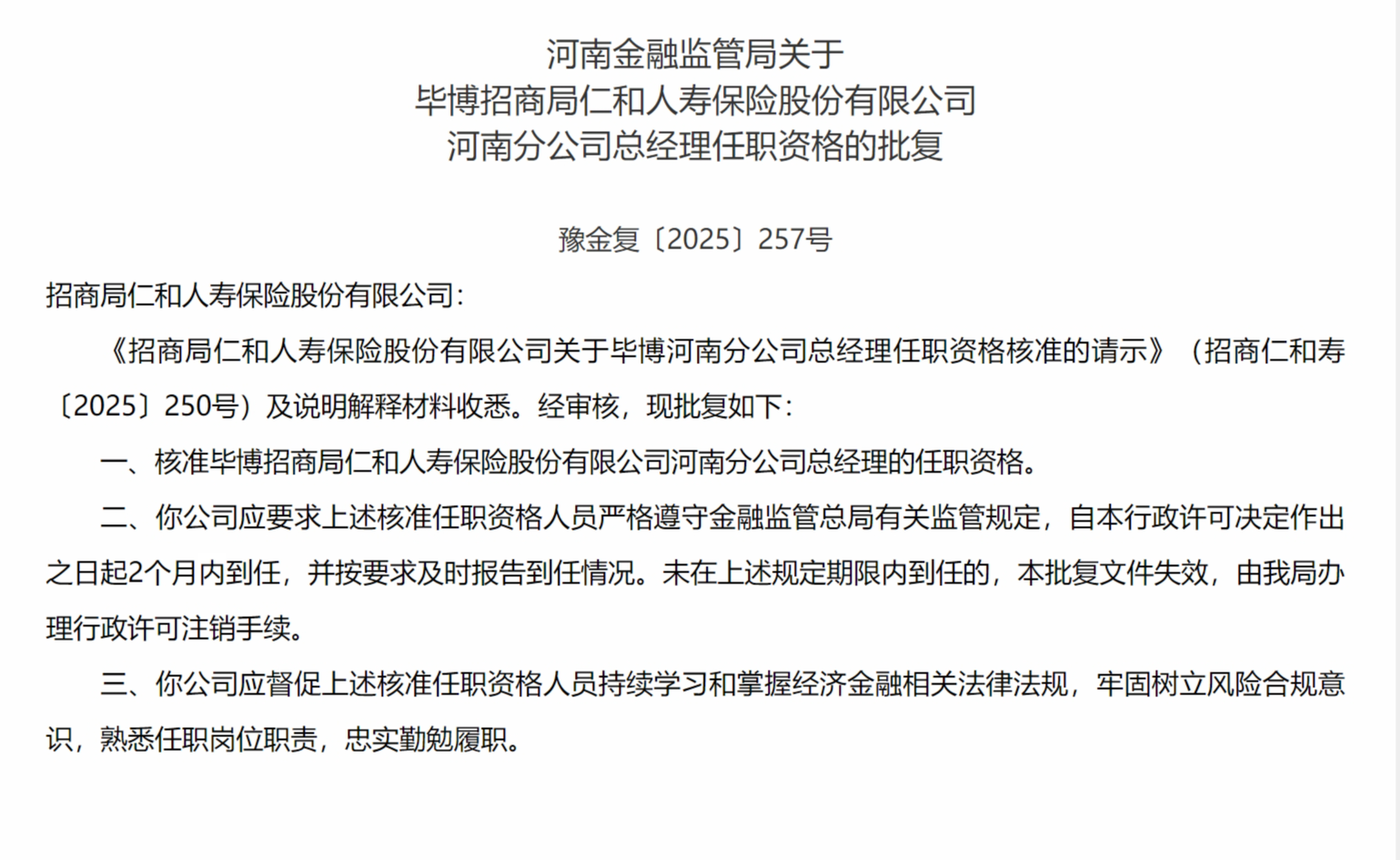 10月31日,河南金融监管局发布关于毕博招商局仁和人寿保险股份有限公司河南分公司总经理任职资格的批复,核准毕博招商局仁和人寿保险股份有限公司河南分公司总经理的任职资格。