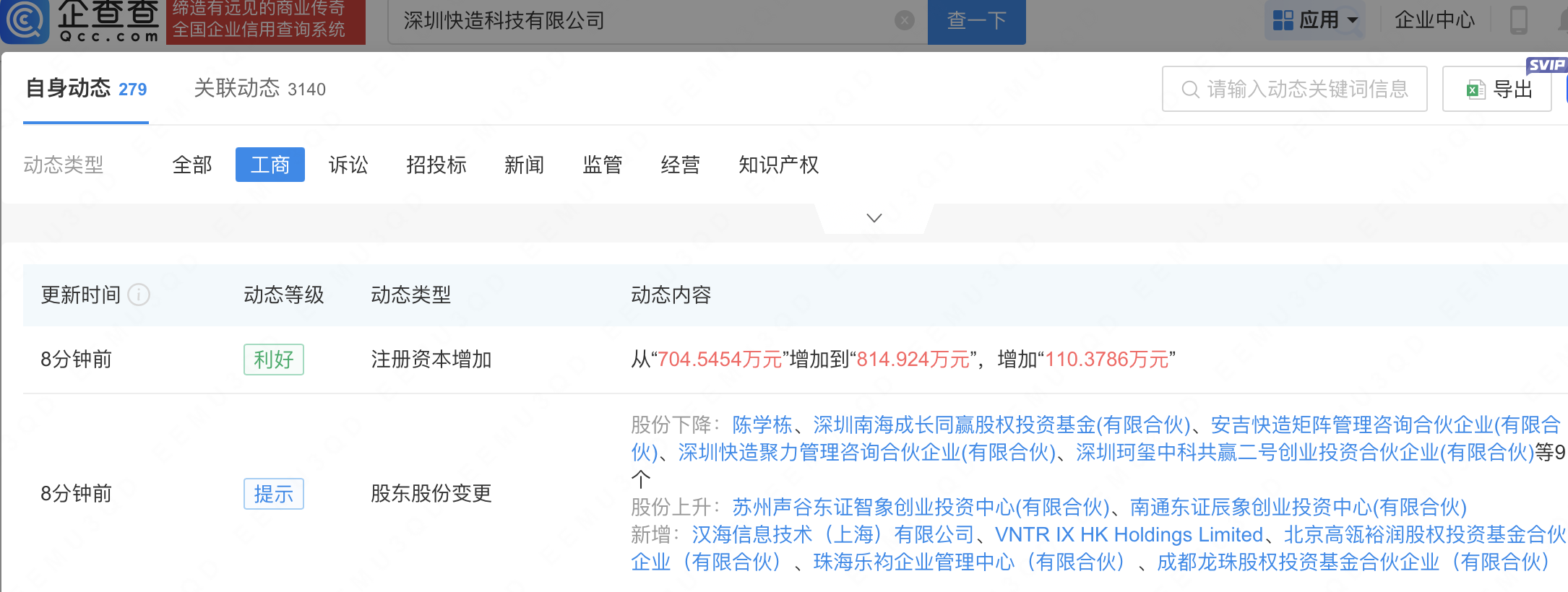 近日,深圳快造科技有限公司发生工商变更,新增美团关联公司汉海信息技术(上海)有限公司、成都龙珠股权投资基金合伙企业(有限合伙)等为股东,同时注册资本增至814.92万元。企查查信息显示,该公司成立于2016年,法定代表人为陈学栋,经营范围包含:机器人、自动化设备、机电产品、电子产品、电源产品、塑料制品、金属制品、计算机软硬件和检测设备的研发等。公开信息显示,快造科技是一家集研发、生产和销售桌面级多功能3D打印机公司。